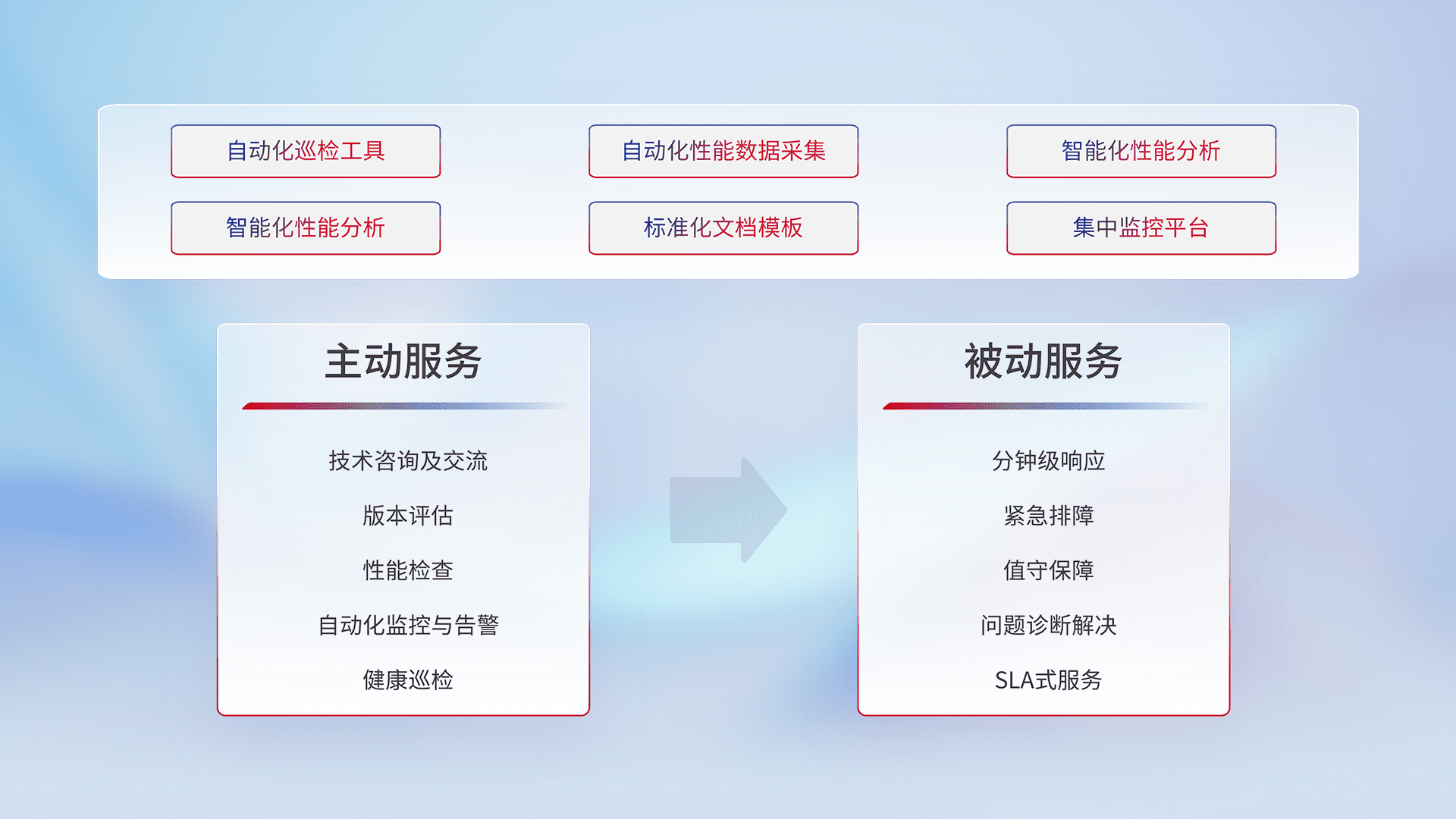 智能化工具和标准化文档,,,,保障服务质量,,提供主动服务(包含技术咨询、、版本评估、、性能检查、、自动化监控与告警、、健康巡检)和被动服务包含(分钟级响应、、紧急排障、、、值守保障、、、、问题诊断解决、、SLA服务)。。