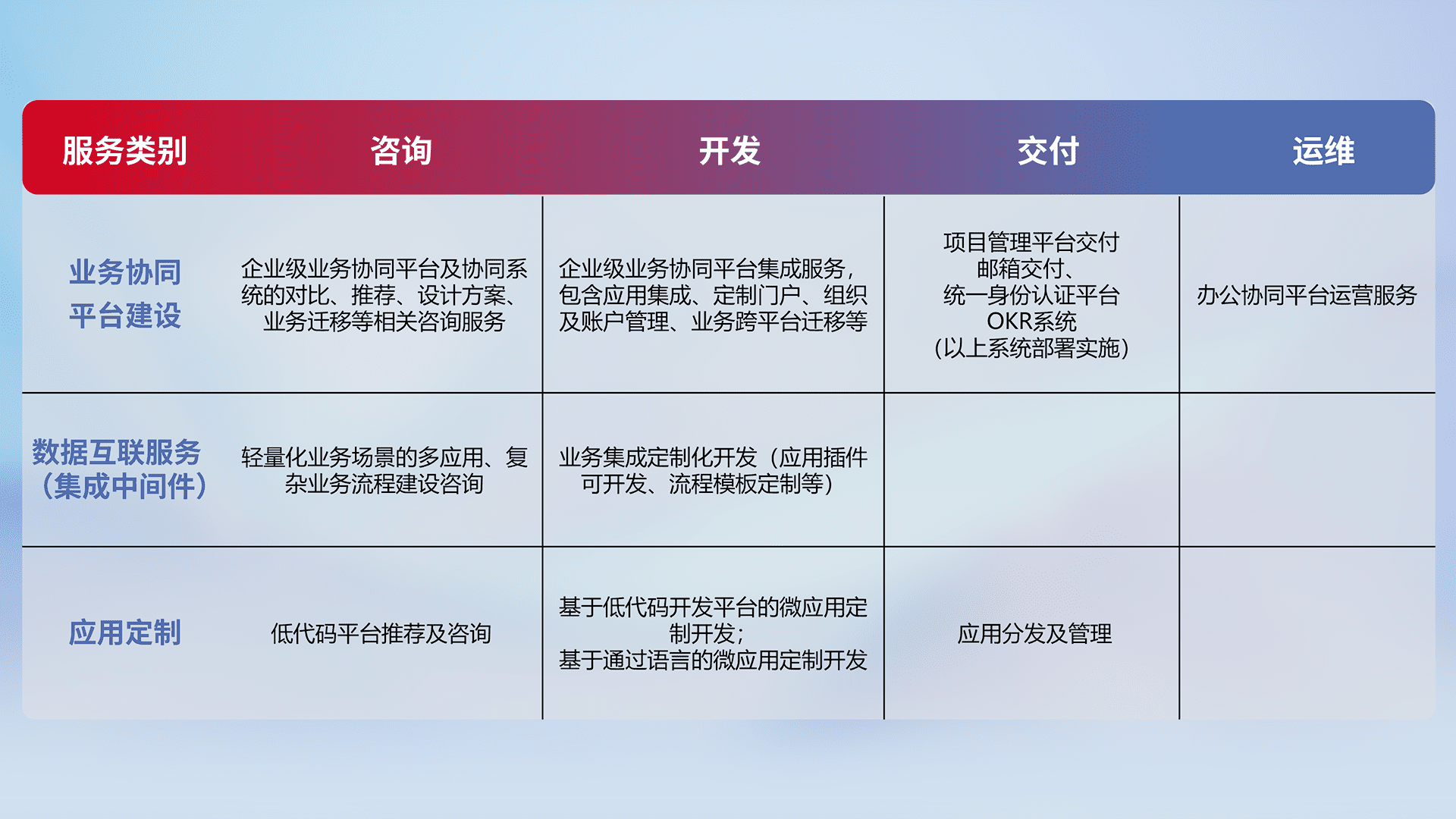 针对钉钉、、企微、、、、IDaas等平台级产品提供产品的规划、、、、方案、、、、交付、、、、定制化开发等服务,,,实现如统一协同办公、、、、智能客户服务、、、、混合会议管理、、、、智能数据查询、、等业务场景,,,,实现数字化转型。。。。